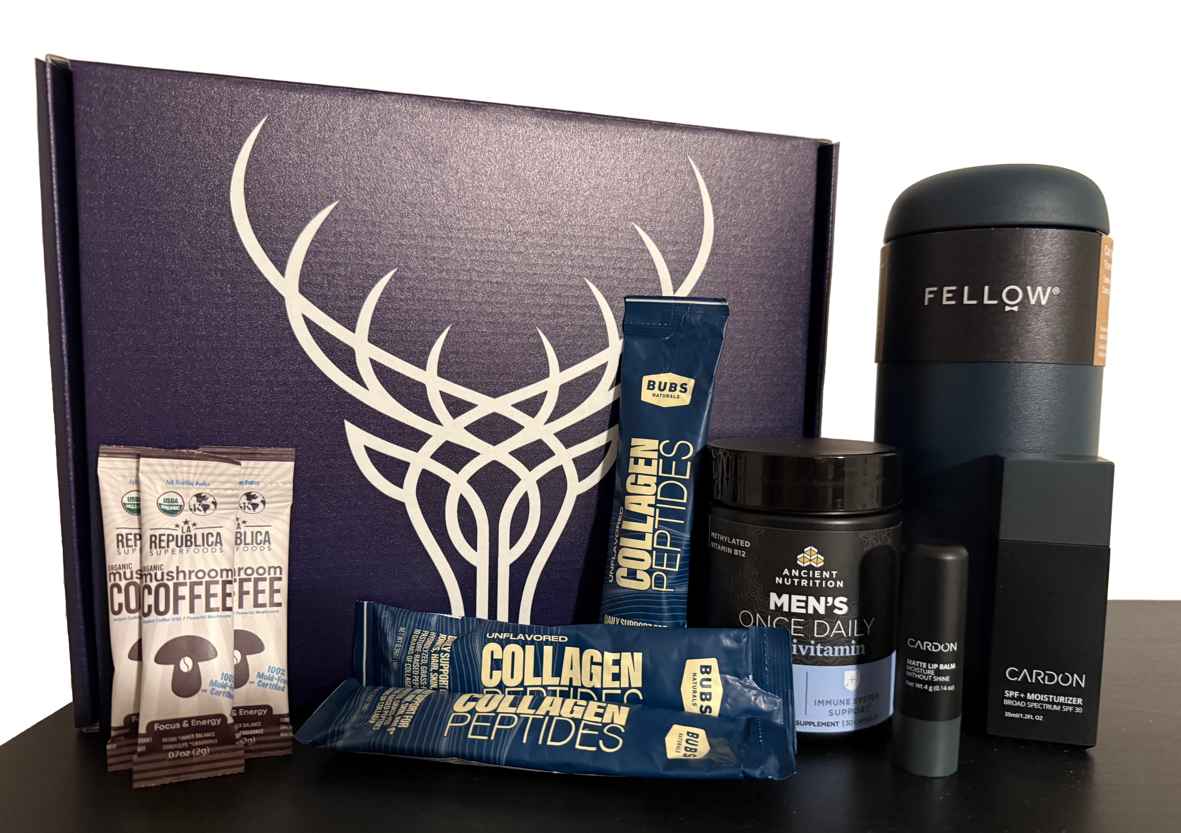 Fellow 16oz Carter Move Travel Mug, Ancient Multi Men's Once Daily Vitamin Supplement, La Republica Instant Mushroom Coffee Organic - 3-pack single serve, Cardon Mens SPF 30 Korean Sunscreen for Face, Facial Moisturizer with Sunblock 1 bottle - 35ml, 1 x Cardon Lip Balm for Men and BUBS Natural Unflavored Collagen Peptides Powder - (3 sticks)